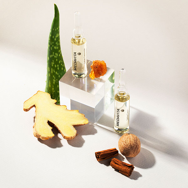 A base de Romero, Canela, Aloe, Gálbano, Cálamo, Alcanfor, Mirra, Nuez Moscada, Jengibre, Arnica montana